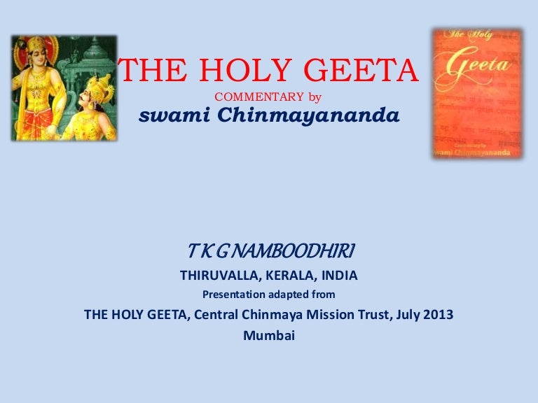 The Holy Geeta Commentary by Swami Chinmayananda. Bhagavad Gita: The Gospel for Holy Life (Sanskrit Text, English Translation and Notes on the. The Holy Geeta, a modern Commentary on Srimad Bhagawad Geeta, by Swami Chinmayananda is one of the most sought after commentaries of the Bhagvad. Holy Geeta by Swami Chinmayananda. The Bhagavad Gita: Text, Word-to-word Meaning, Translation and Commentary by Swami Sivananda. Bhagavad Gita all 18 Chapters in Sanskrit by H.H Swami Brahmananda, Chinmaya Mission (Courtesy of Central Chinmaya Mission Trust) NOTE: Gita Chanting by Swami Brahmananda may not be reproduced without prior approval from Central Chinmaya Mission Trust.